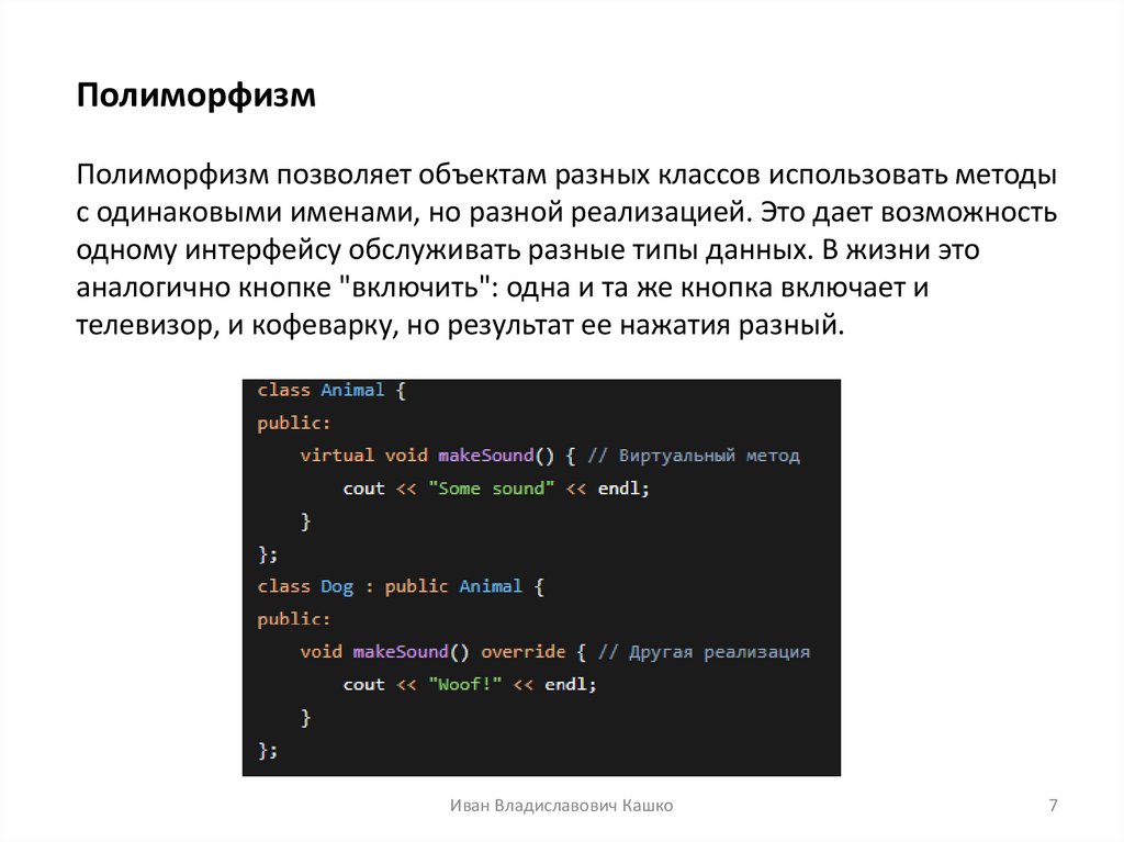 ПолиморфизмПолиморфизм позволяет объектам разных классов использовать методы