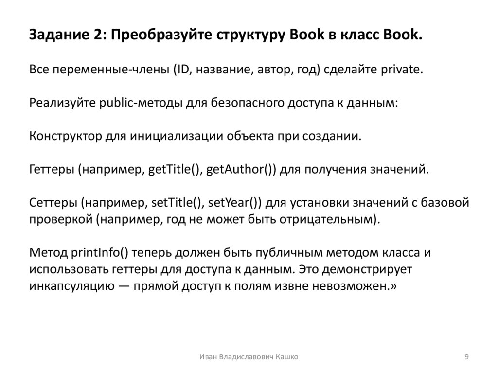 Задание 2: Преобразуйте структуру Book в класс Book.Все переменные-члены (ID, название, автор, год) сделайте private.
