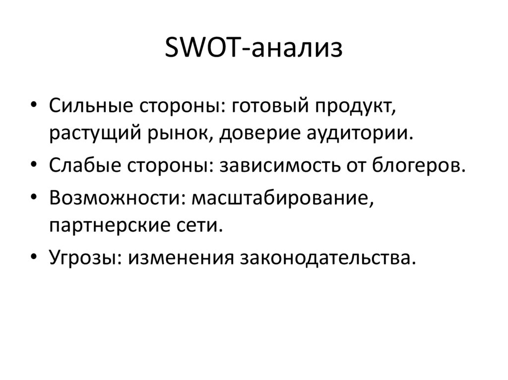 SWOT-анализ• Сильные стороны: готовый продукт,