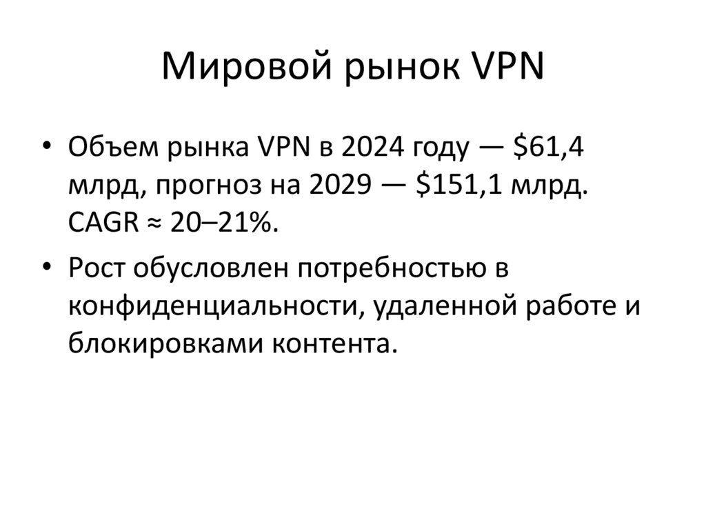 Мировой рынок VPN• Объем рынка VPN в 2024 году — $61,4