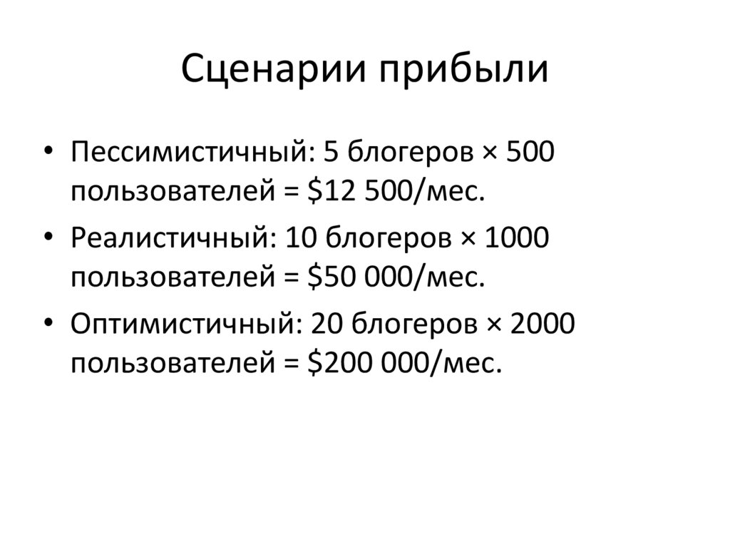 Сценарии прибыли• Пессимистичный: 5 блогеров × 500