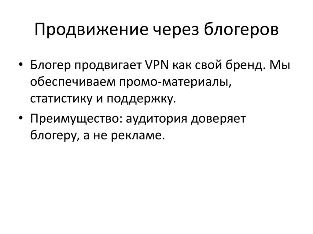 Продвижение через блогеров• Блогер продвигает VPN как свой бренд. Мы