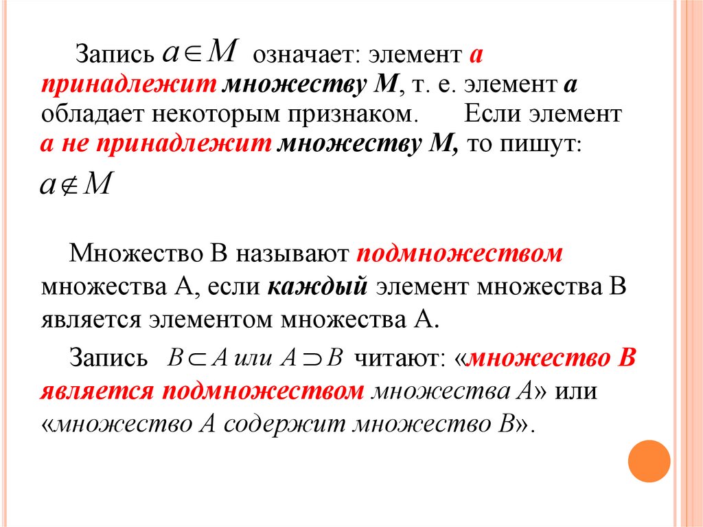 Запись а М означает: элемент апринадлежит множеству М, т. е. элемент a