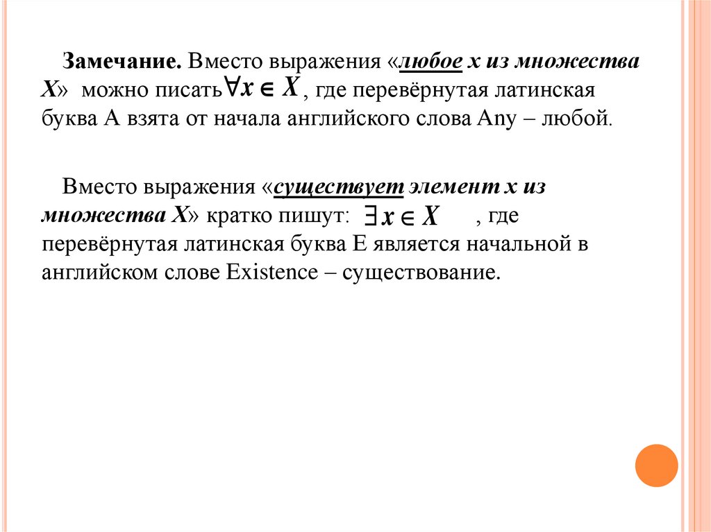 Замечание. Вместо выражения «любое х из множестваХ» можно писать x X , где перевёрнутая латинская