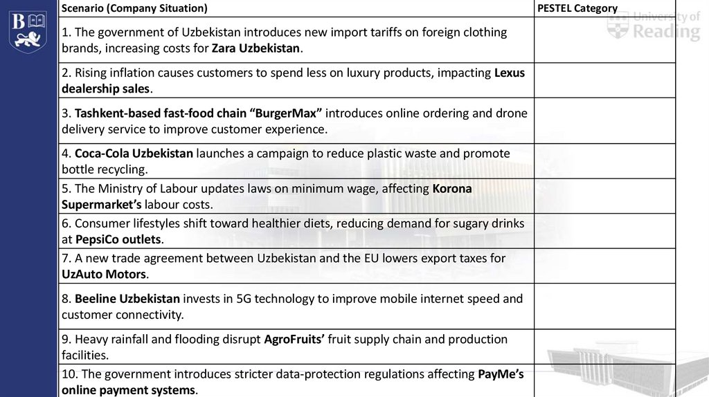 Scenario (Company Situation)1. The government of Uzbekistan introduces new import tariffs on foreign clothing