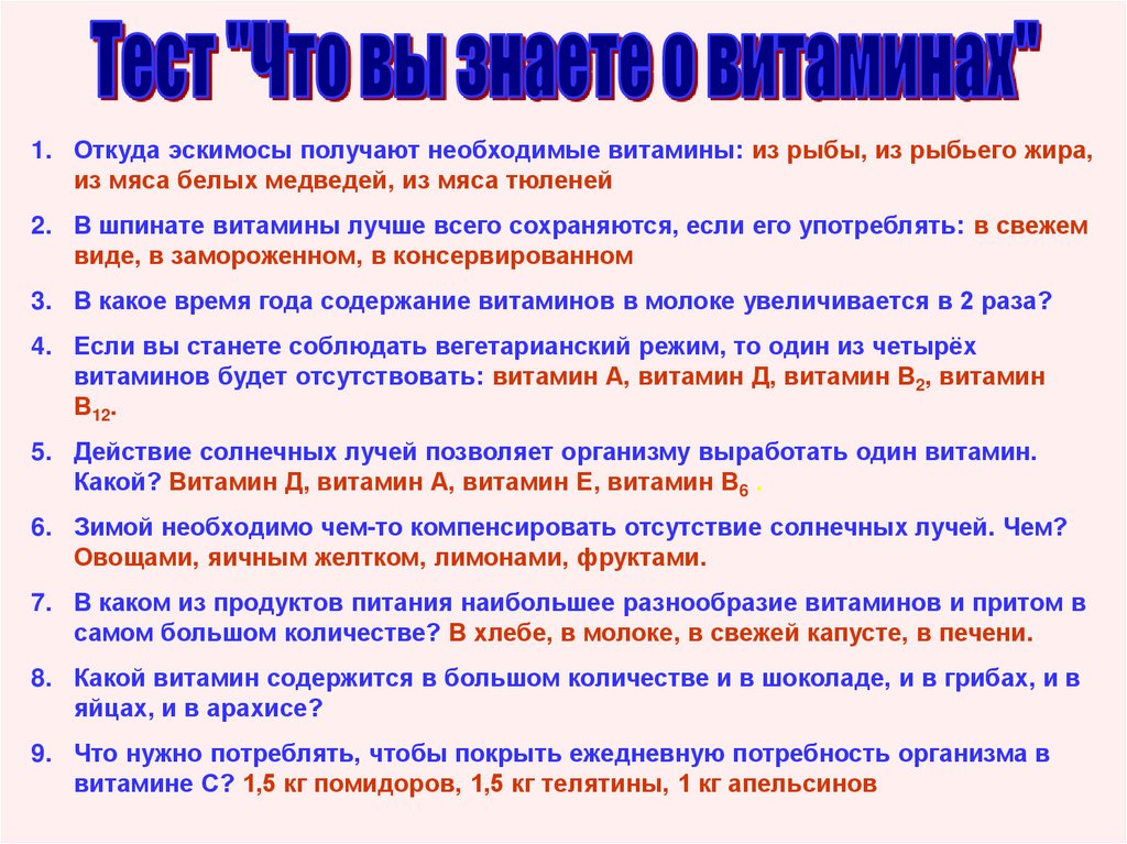 1. Откуда эскимосы получают необходимые витамины: из рыбы, из рыбьего жира,из мяса белых медведей, из мяса тюленей