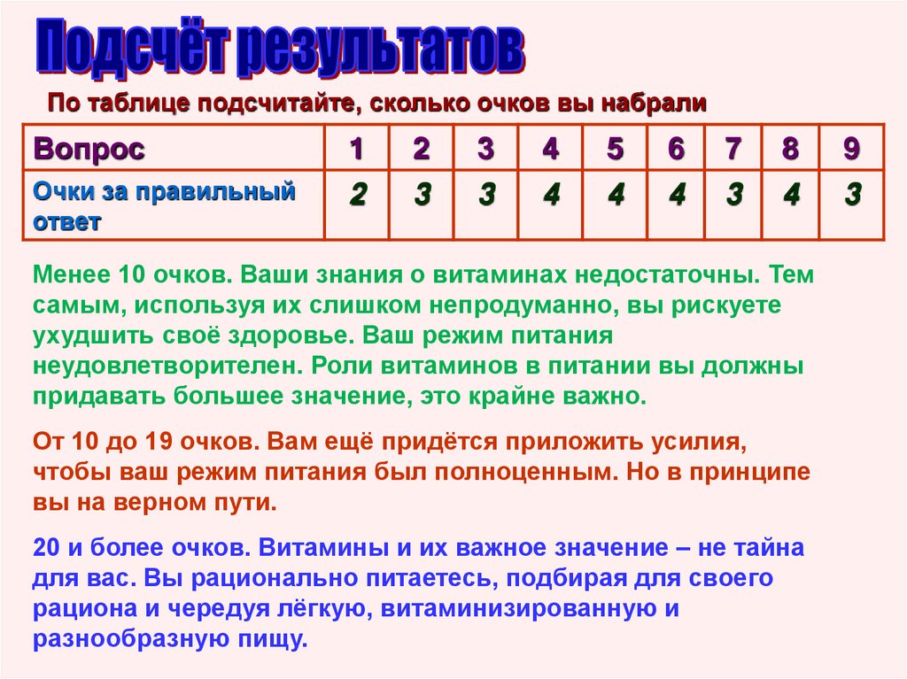 По таблице подсчитайте, сколько очков вы набралиВопрос