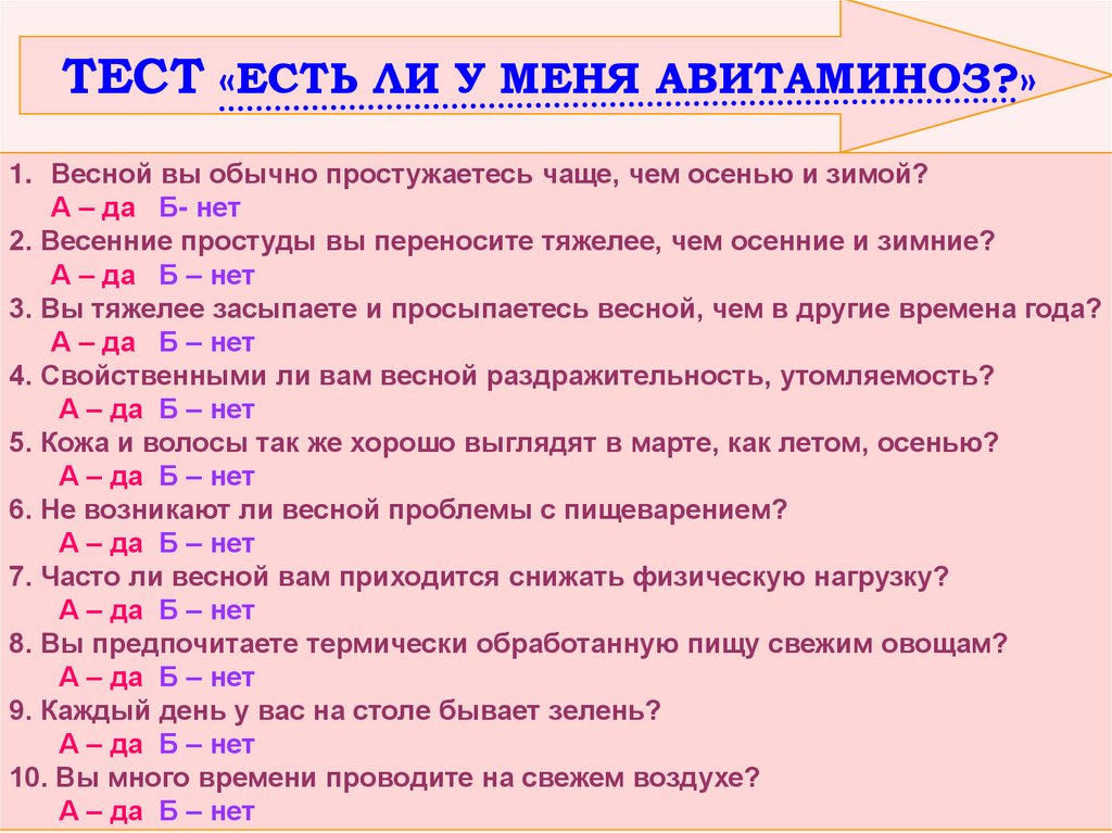 ТЕСТ «ЕСТЬ ЛИ У МЕНЯ АВИТАМИНОЗ?»1. Весной вы обычно простужаетесь чаще, чем осенью и зимой?