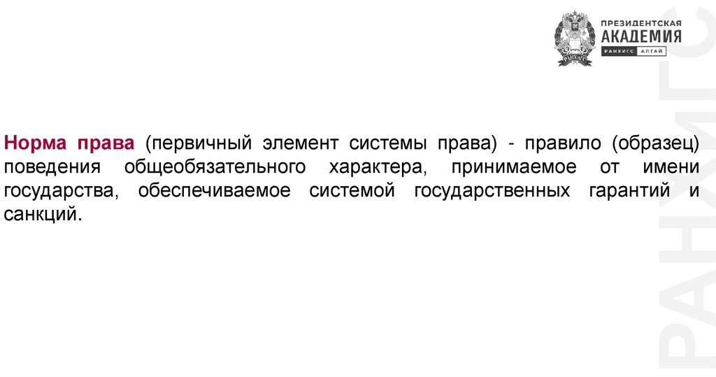 РАНХиГСНорма права (первичный элемент системы права) - правило (образец)