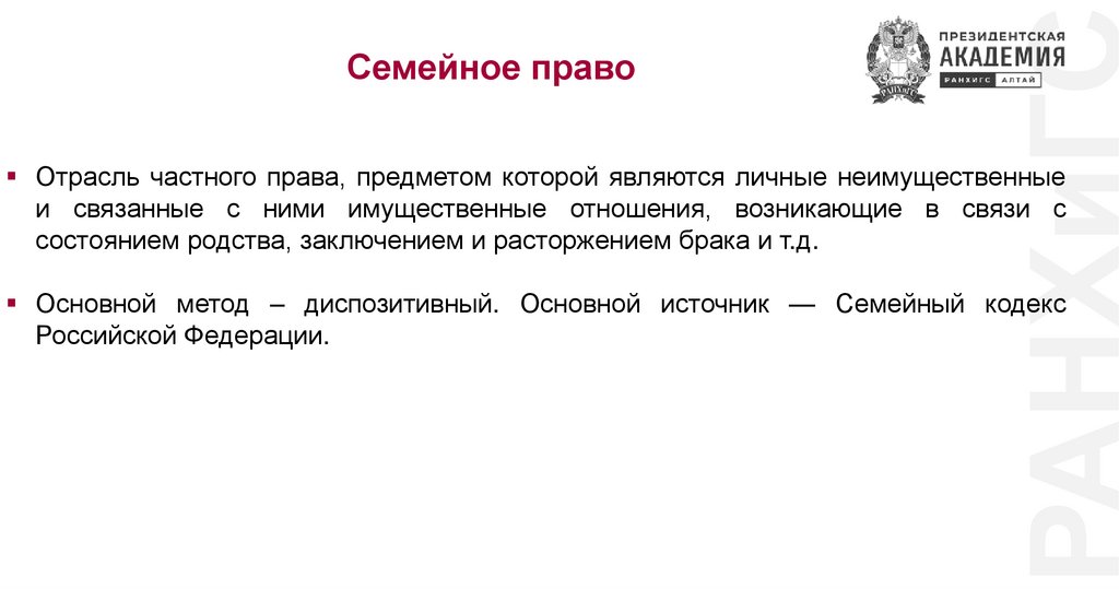 Основной метод – диспозитивный. Основной источник — Семейный кодекс