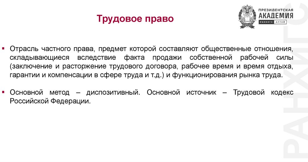 Основной метод – диспозитивный. Основной источник – Трудовой кодекс