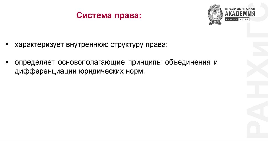характеризует внутреннюю структуру права;определяет основополагающие принципы объединения и