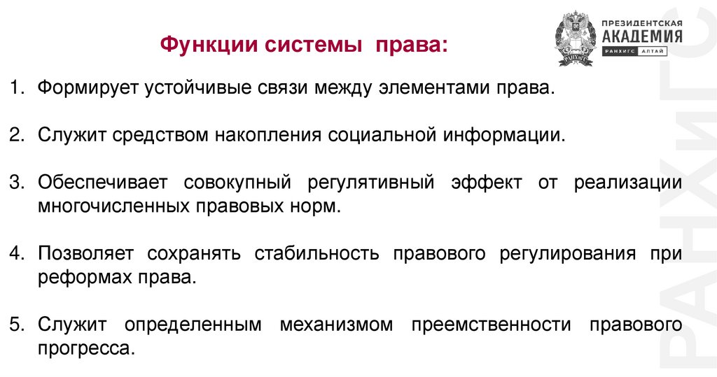 1. Формирует устойчивые связи между элементами права.2. Служит средством накопления социальной информации.
