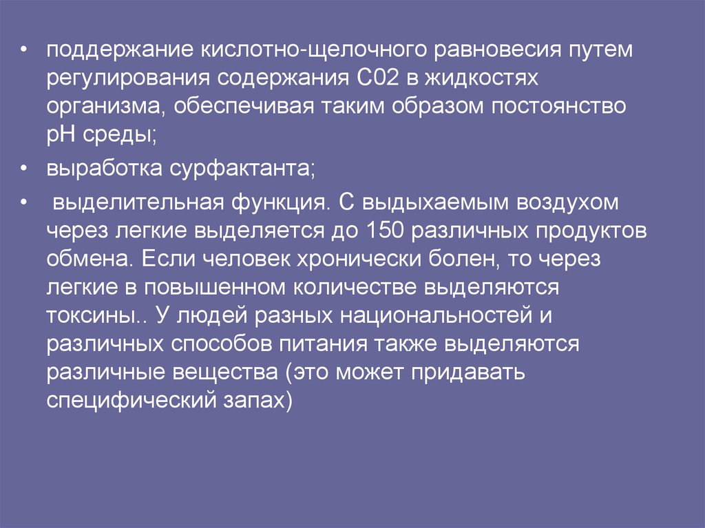 • поддержание кислотно-щелочного равновесия путемрегулирования содержания С02 в жидкостях