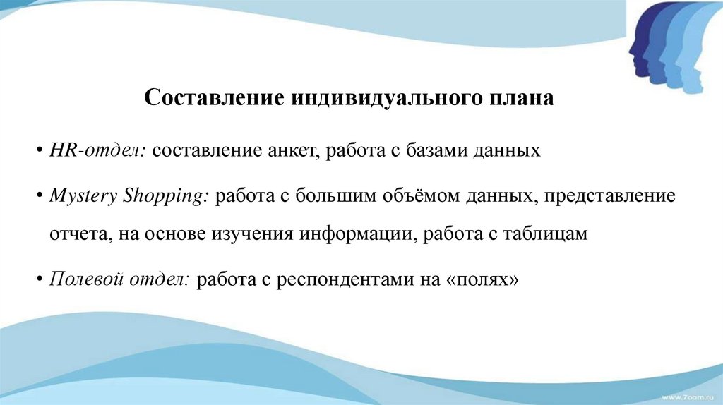 Составление индивидуального плана• HR-отдел: составление анкет, работа с базами данных