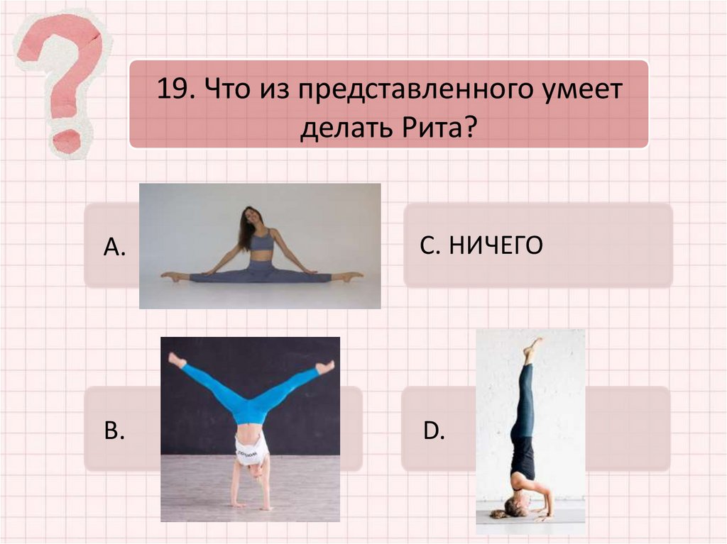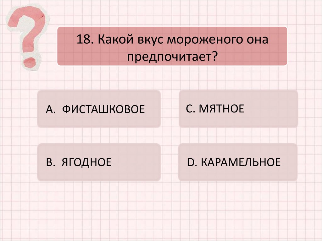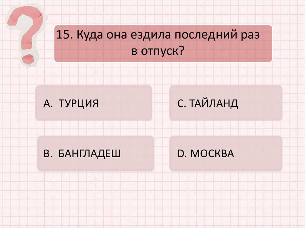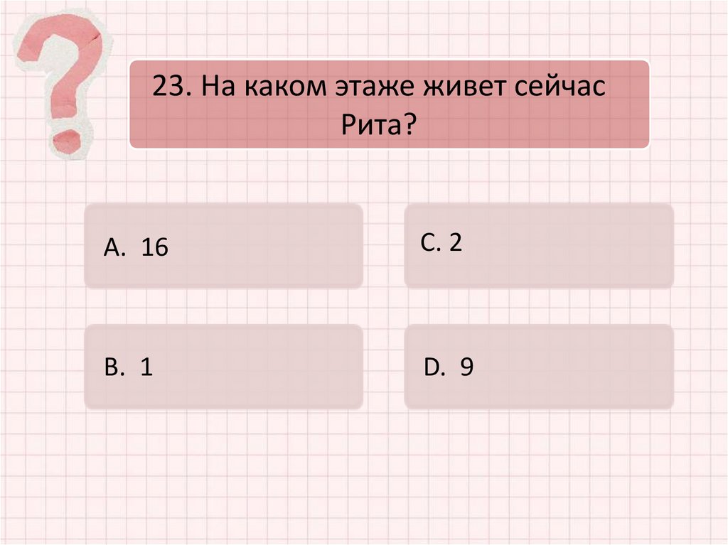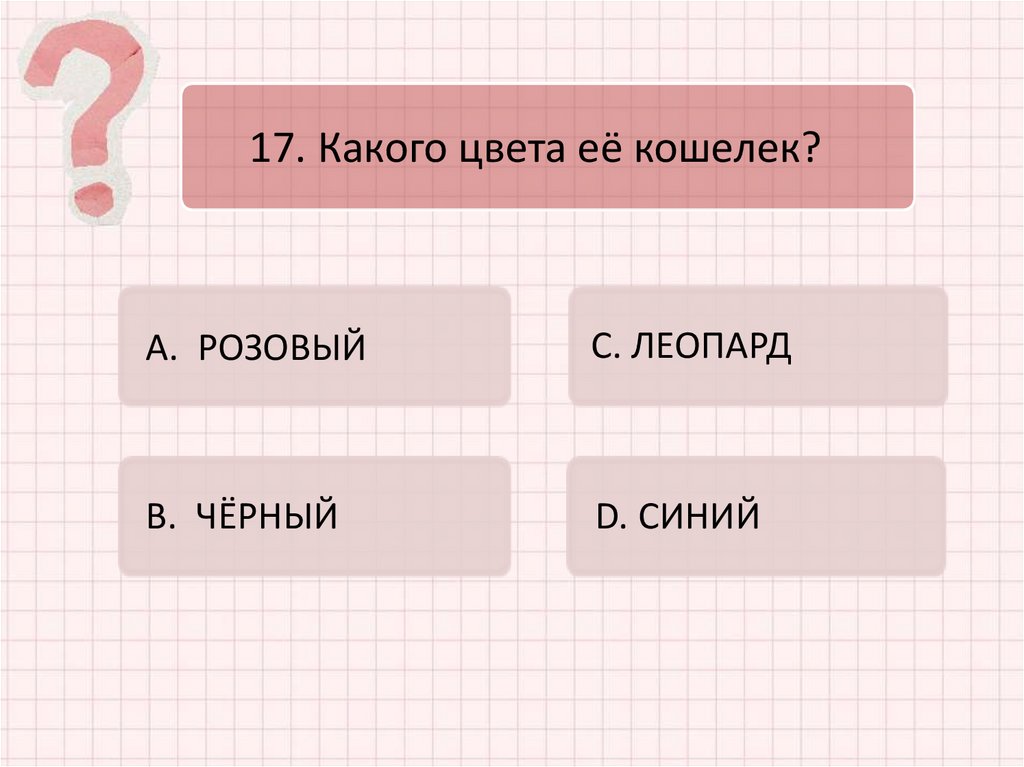 17. Какого цвета её кошелек?А. РОЗОВЫЙ