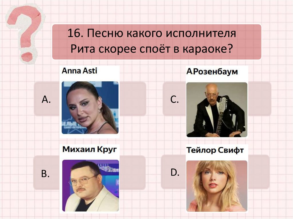 16. Песню какого исполнителяРита скорее споёт в караоке?