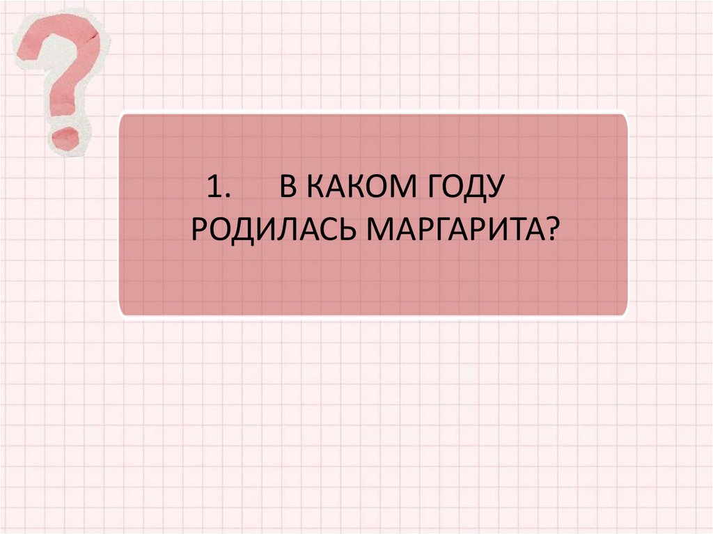 1. В КАКОМ ГОДУРОДИЛАСЬ МАРГАРИТА?