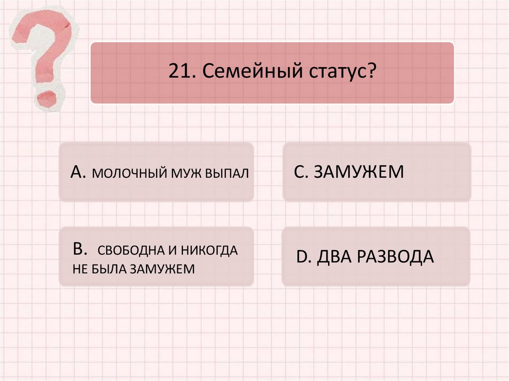 21. Семейный статус?А. МОЛОЧНЫЙ МУЖ ВЫПАЛ