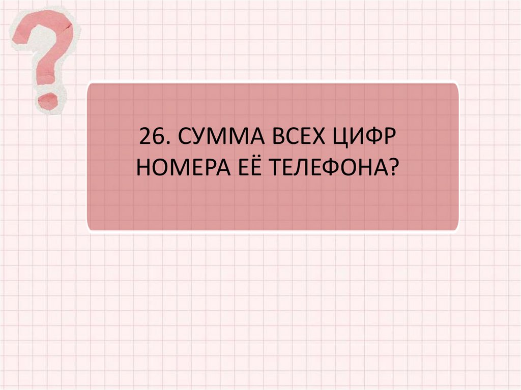 26. СУММА ВСЕХ ЦИФРНОМЕРА ЕЁ ТЕЛЕФОНА?