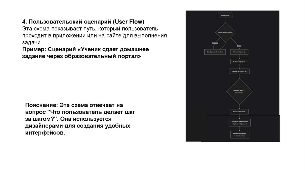 4. Пользовательский сценарий (User Flow)Эта схема показывает путь, который пользователь