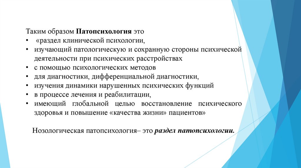 Таким образом Патопсихология это• «раздел клинической психологии,