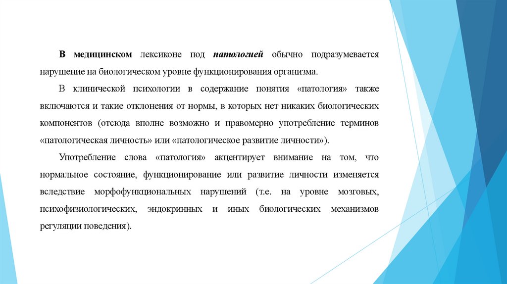 В медицинском лексиконе под патологией обычно подразумеваетсянарушение на биологическом уровне функционирования организма.