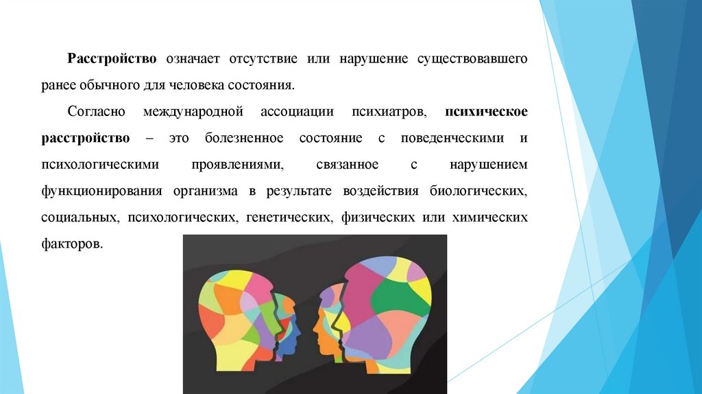 Расстройство означает отсутствие или нарушение существовавшегоранее обычного для человека состояния.