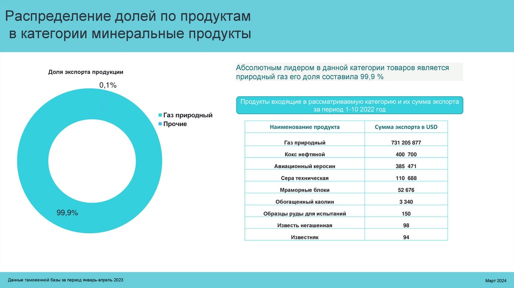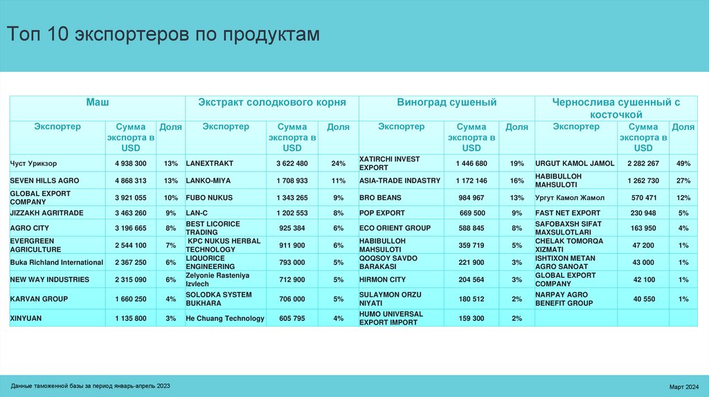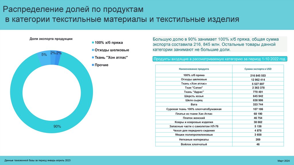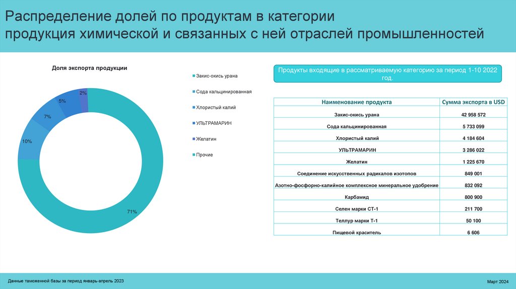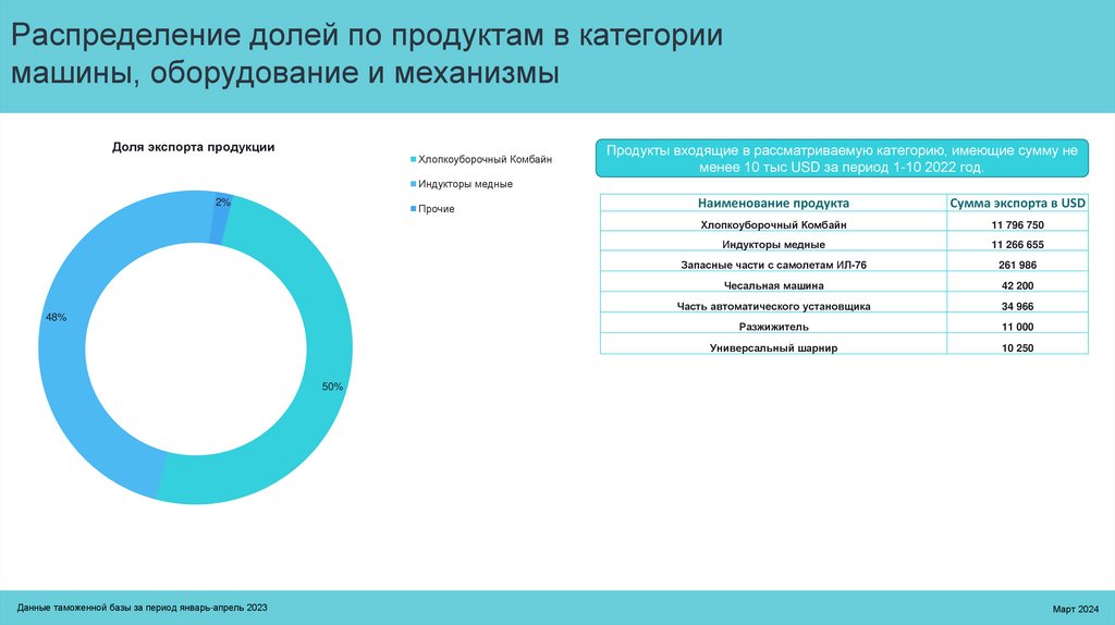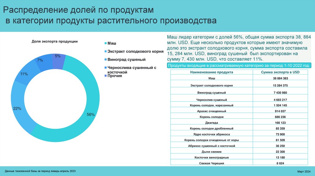 Продукты входящие в рассматриваемую категорию и их сумма экспорта