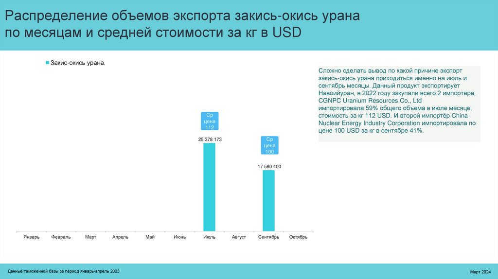 Распределение объемов экспорта закись-окись уранапо месяцам и средней стоимости за кг в USD