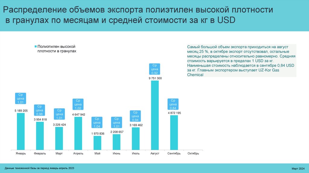 Распределение объемов экспорта полиэтилен высокой плотностив гранулах по месяцам и средней стоимости за кг в USD