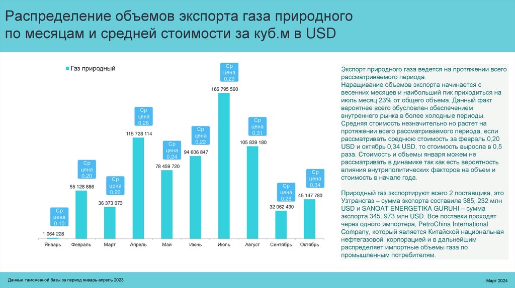 Распределение объемов экспорта газа природногопо месяцам и средней стоимости за куб.м в USD