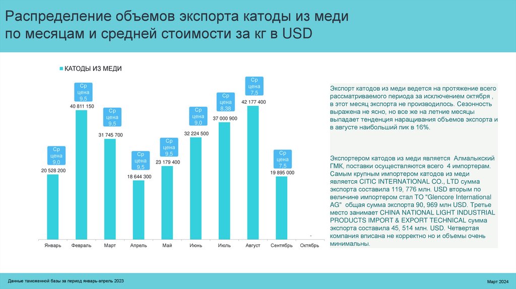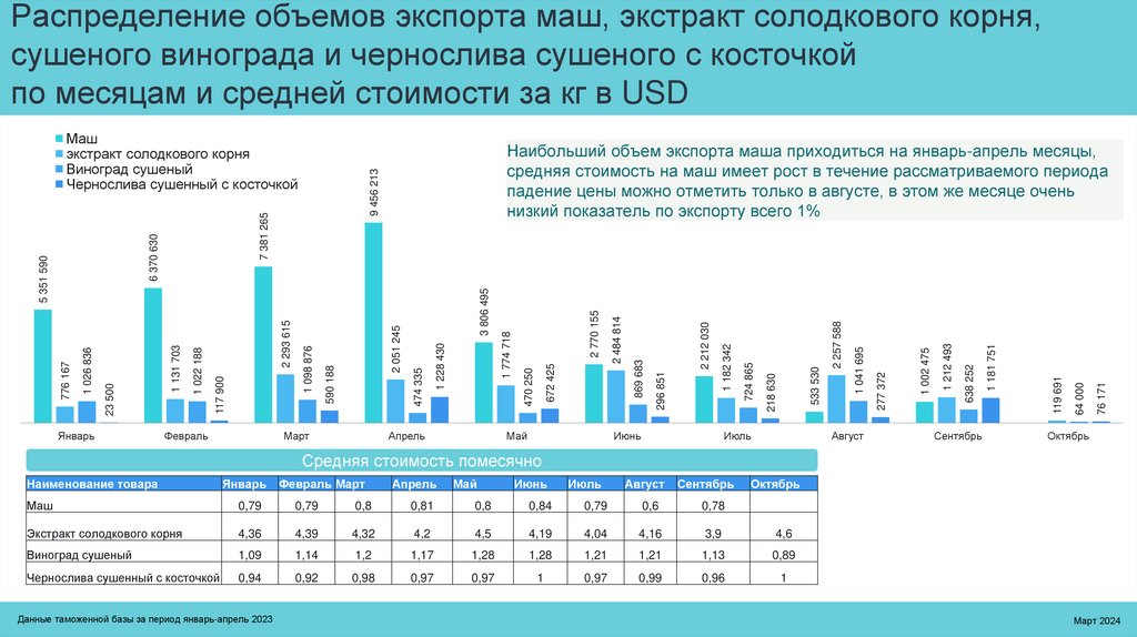 Распределение объемов экспортапо месяцам и средней стоимости за кг в USD