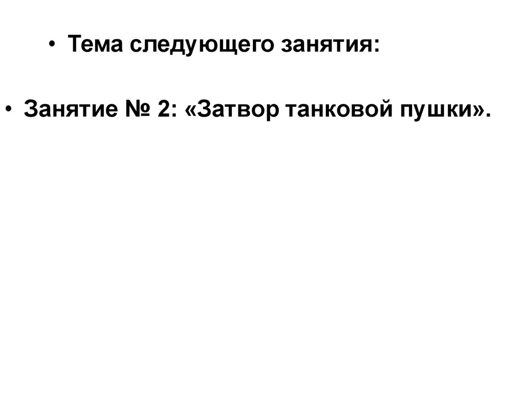 • Тема следующего занятия:• Занятие № 2: «Затвор танковой пушки».