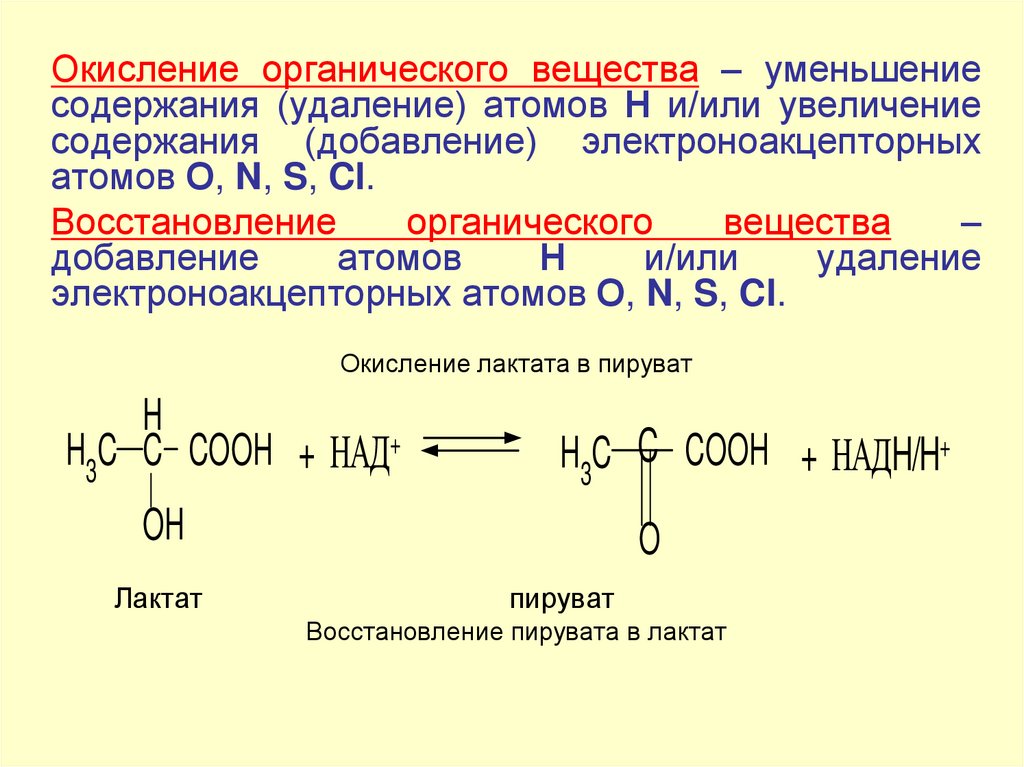 Окисление органического вещества – уменьшениесодержания (удаление) атомов Н и/или увеличение