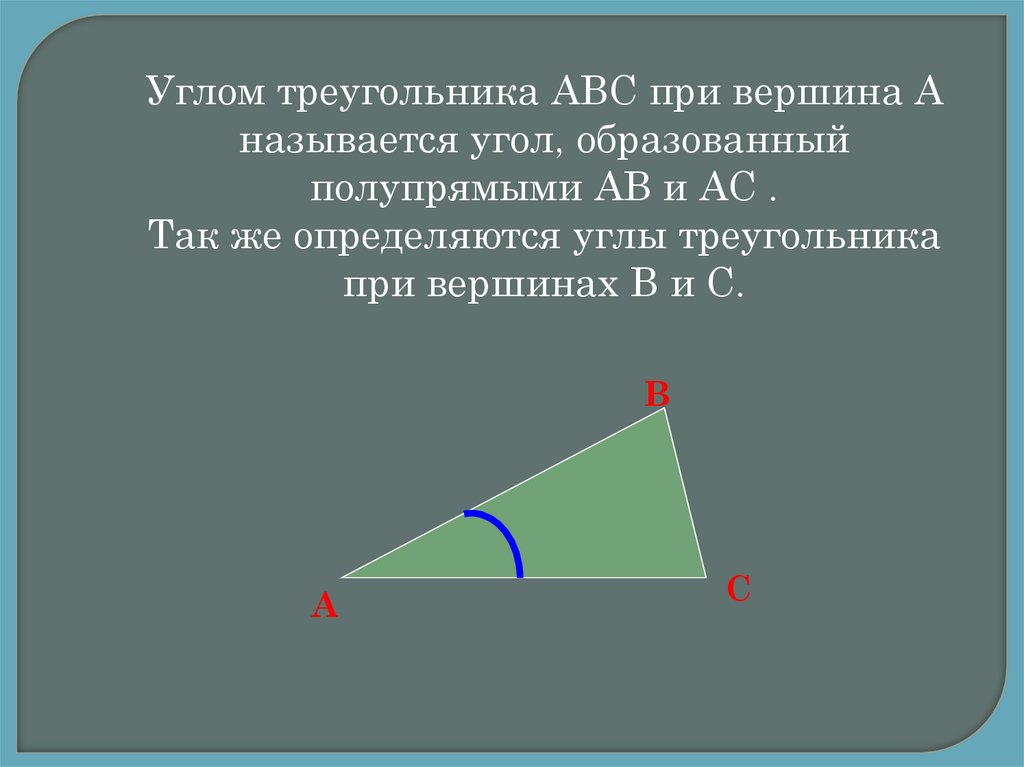 Углом треугольника АВС при вершина Аназывается угол, образованный