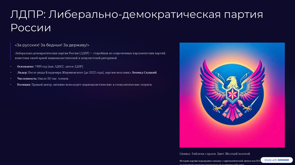 Лидер: После ухода Владимира Жириновского (до 2022 года), партию возглавил Леонид Слуцкий.