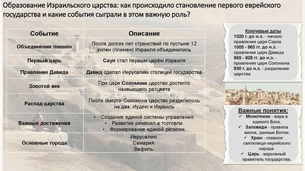 Образование Израильского царства: как происходило становление первого еврейскогогосударства и какие события сыграли в этом важную роль?