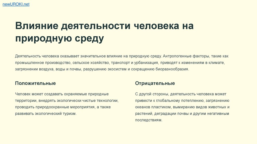 Деятельность человека оказывает значительное влияние на природную среду. Антропогенные факторы, такие как
