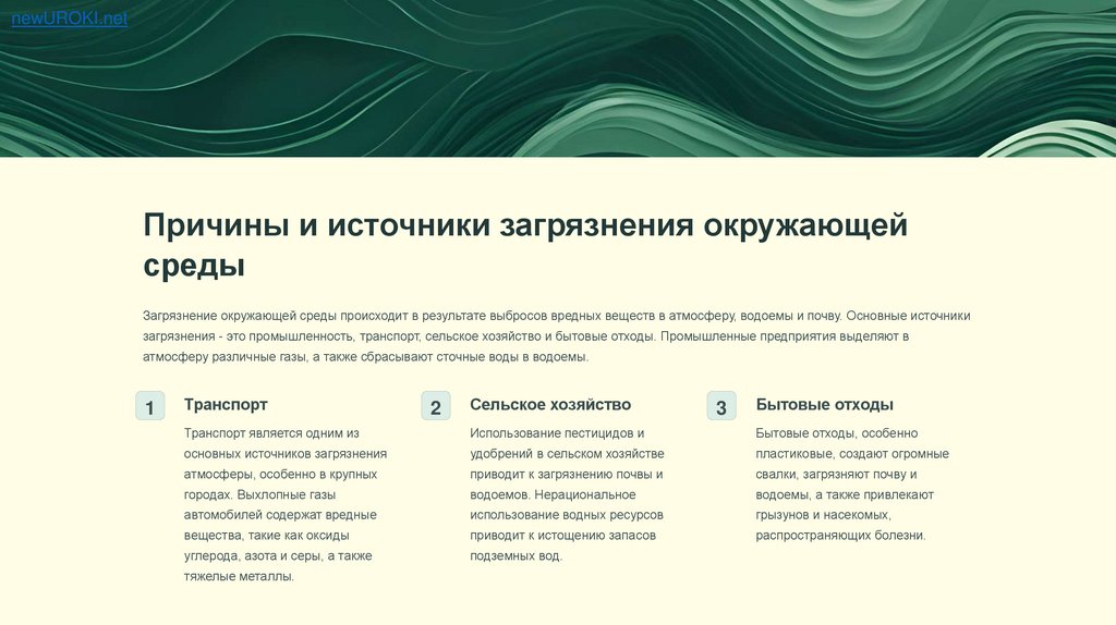загрязнения - это промышленность, транспорт, сельское хозяйство и бытовые отходы. Промышленные предприятия выделяют в