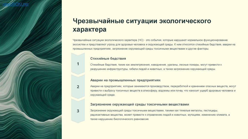 экосистем и представляют угрозу для здоровья человека и окружающей среды. К ним относятся стихийные бедствия, аварии на