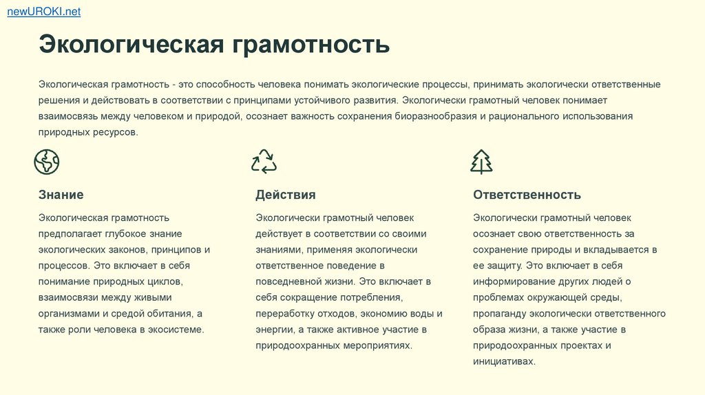 решения и действовать в соответствии с принципами устойчивого развития. Экологически грамотный человек понимает