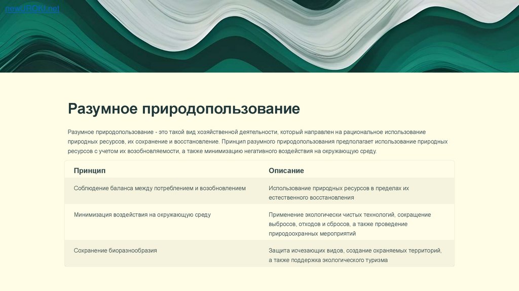 природных ресурсов, их сохранение и восстановление. Принцип разумного природопользования предполагает использование природных