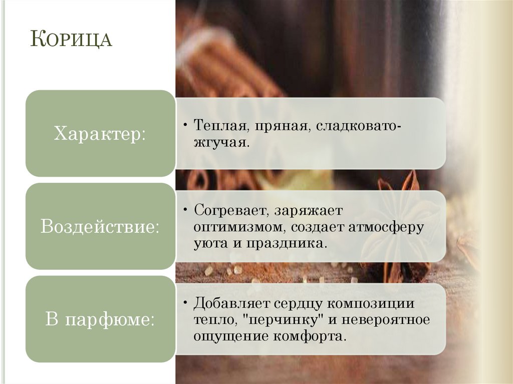 • Теплая, пряная, сладковатожгучая.