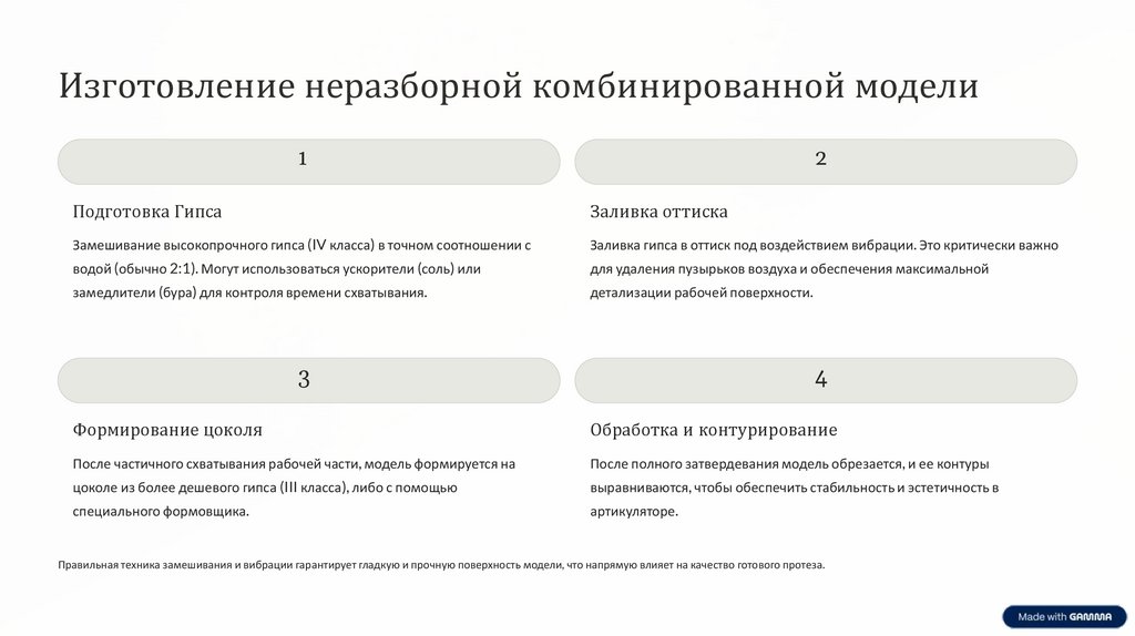 Правильная техника замешивания и вибрации гарантирует гладкую и прочную поверхность модели, что напрямую влияет на качество готового протеза.
