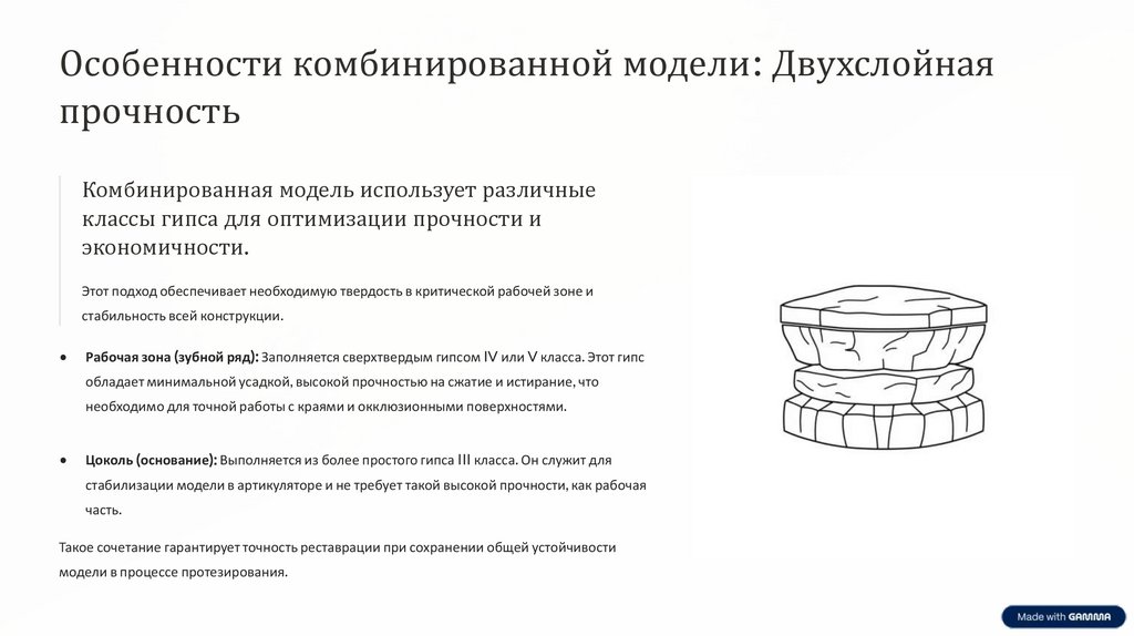 Рабочая зона (зубной ряд): Заполняется сверхтвердым гипсом IV или V класса. Этот гипс