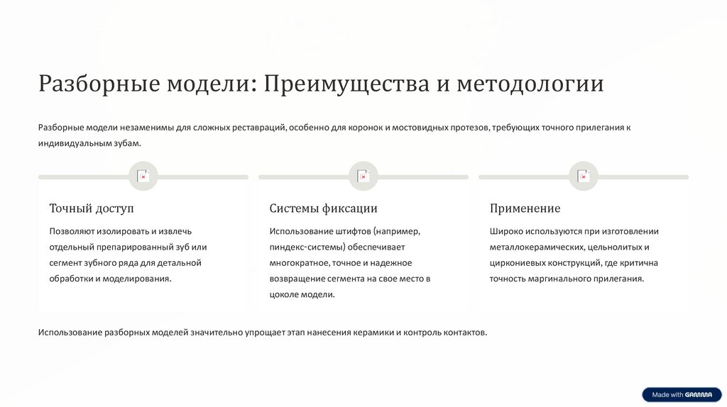 Разборные модели: Преимущества и методологииРазборные модели незаменимы для сложных реставраций, особенно для коронок и мостовидных протезов, требующих точного прилегания к