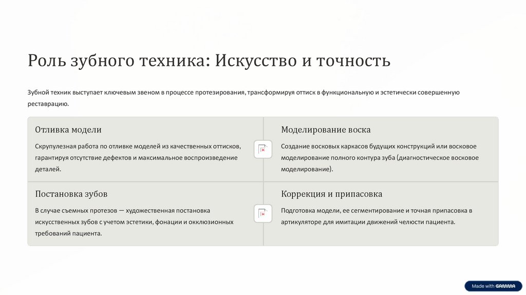 Роль зубного техника: Искусство и точностьЗубной техник выступает ключевым звеном в процессе протезирования, трансформируя оттиск в функциональную и эстетически совершенную