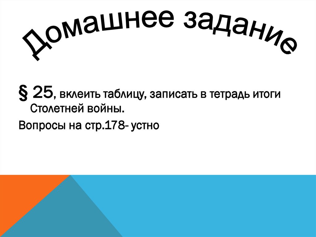 § 25, вклеить таблицу, записать в тетрадь итогиСтолетней войны.