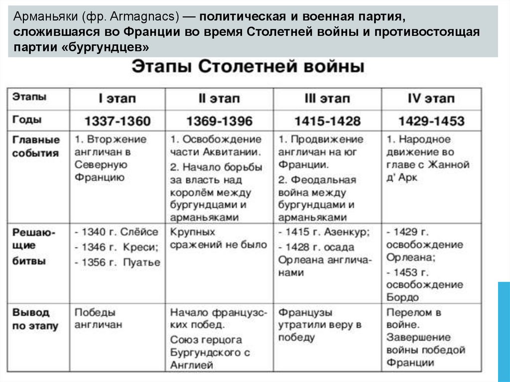 Арманьяки (фр. Armagnacs) — политическая и военная партия,сложившаяся во Франции во время Столетней войны и противостоящая
